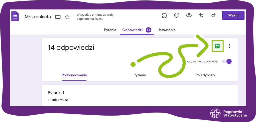 3. W zakładce z odpowiedziami kliknij w ikonkę Google Sheets umieszczoną w prawym górnym rogu: