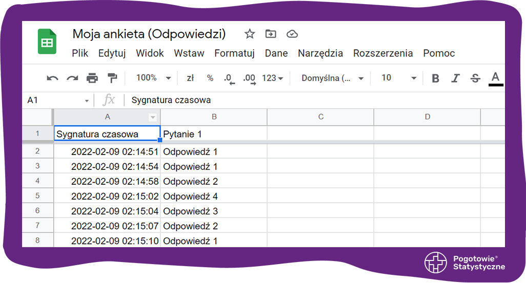 Google Forms oferuje dość rozbudowane funkcje, a przy tym prosty intuicyjny interfejs. Jego zaletą jest też fakt, że uzyskiwane odpowiedzi trafiają automatycznie do Arkuszy Google (Google Sheets), skąd w łatwy sposób można pobrać je formacie Excel (.xlsx). Taka baza danych na jasną strukturę i stanowi dobry punkt wyjścia do dalszej analizy specjalistycznych pakietach statystycznych, takich jak R, SPSS, Statistica czy jamovi.
