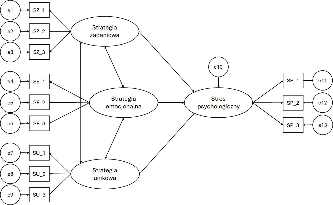 Elipsy – zmienne latentne (ukryte), reprezentują dany konstrukt teoretyczny, niemierzalny bezpośrednio (w tym przypadku strategie radzenia sobie ze stresem jako predyktory i stres jako zmienna wyjaśniana).