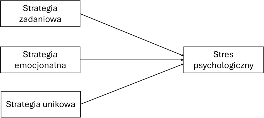 Strzałka dwukierunkowa – kowariancja, związek między poszczególnymi zmiennymi (w naszym przykładzie występują one między strategiami radzenia sobie ze stresem jako predyktorami).