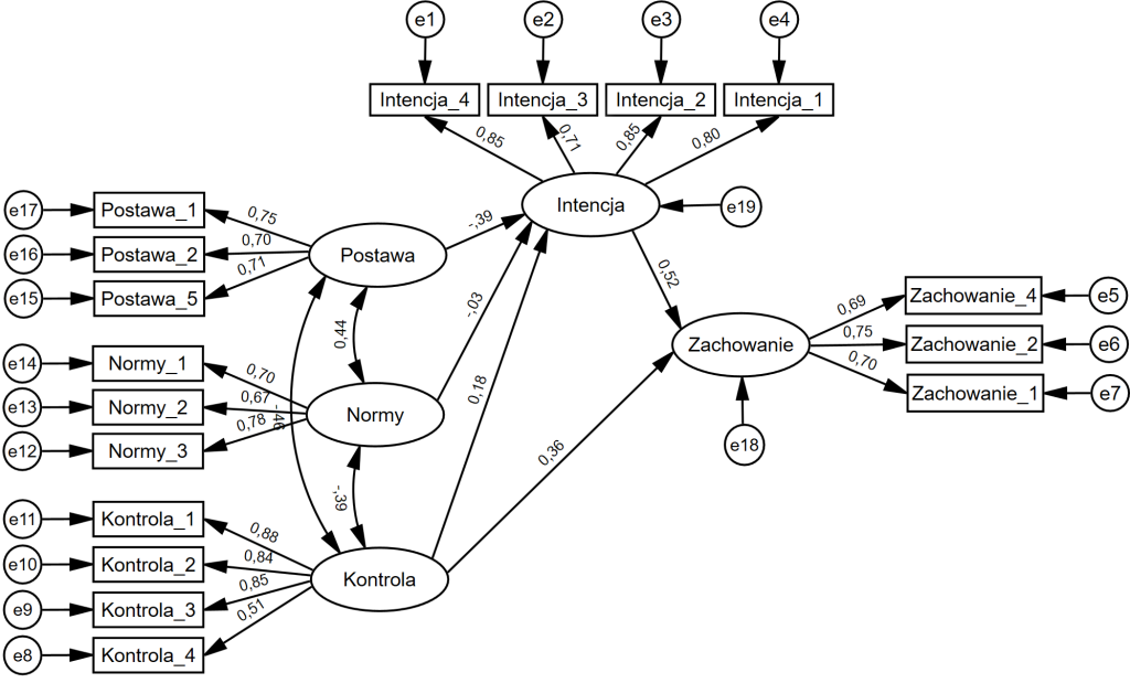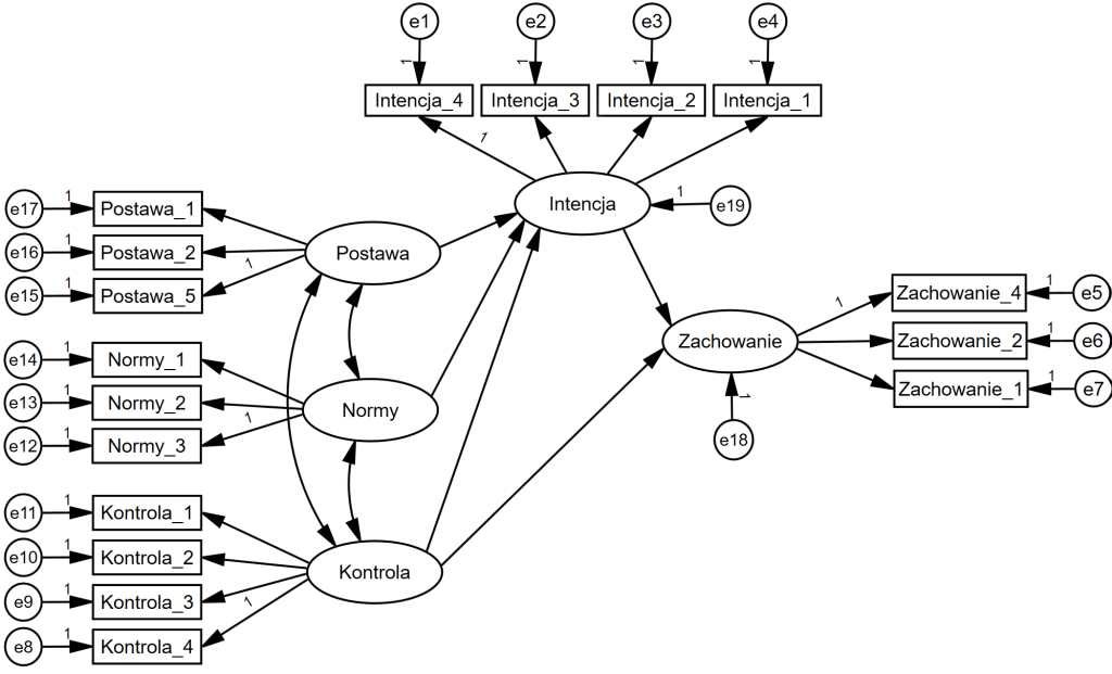 Zmienne „Intencja” i „Zachowanie” stanowią zmienne wyjaśniane (endogeniczne/zależne), dlatego też dla nich również musimy uwzględnić błędy pomiarowe (e18 i e19). W ten sposób uwzględniamy fakt, że poza predyktorami ich wartość zależy też od czynników nieuwzględnionych w modelu.