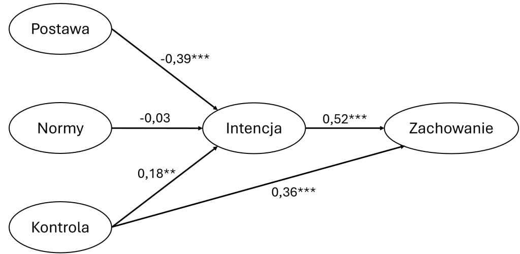 Potwierdzono hipotezy H3, H4 i H5. Wyższe nasilenie kontroli wiązało się z wyższą intencją zachowania (β = 0,18**), a także częstszym inicjowaniem zachowania (β = 0,36**). Wyższe nasilenie intencji wiązało się z wyższą częstotliwością zachowania (β = 0,52***).