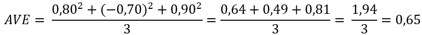 Przykładowo, przyjmijmy że mamy 3 pozycje testowe mierzące Sumienność. Pozycje te wykazują następujące ładunki czynnikowe: 1) 0,80; 2) -0,70; 3) 0,90. Zatem nasza wartość AVE dla Sumienności to: