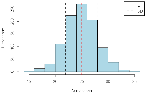 Jak można łatwo zaobserwować na rysunku 1, średnia wynosi 25 punktów, natomiast jedno odchylenie standardowe wynosi nieco ponad 3 punkty. Oznacza to tyle, że większość naszych osób badanych uzyskiwała wyniki w samoocenie mniej więcej na ± 3 punkty od średniej lub że przeciętne wyniki wahały się w przedziale od 22 do 28 punktów w skali samooceny.